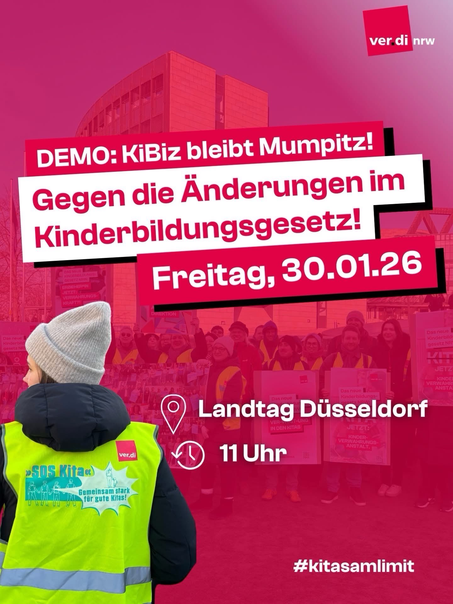 Die massive Kürzung der Finanzierung von Kita-Helfer:innen in kleinen Einrichtungen mit bis zu drei Gruppen bleibt hingegen bestehen und auch vom Kernzeiten-Randzeiten-Modell rückt die Landesregierung nicht ab. Demnach könnte der Einsatz qualifizierten Fachpersonals in den Kitas künftig auf fünfstündige Kernzeiten konzentriert und die Randzeiten mit anderen Betreuern abgedeckt werden. Um die Bedeutung von Qualität in der Primarbildung zu unterstreichen, ruft ver.di zu einer Demonstration gegen die Änderungen im KiBiz vor dem Landtag in Düsseldorf am Freitag, den 30. Januar 2026: